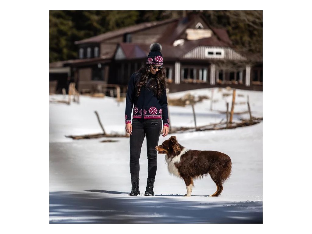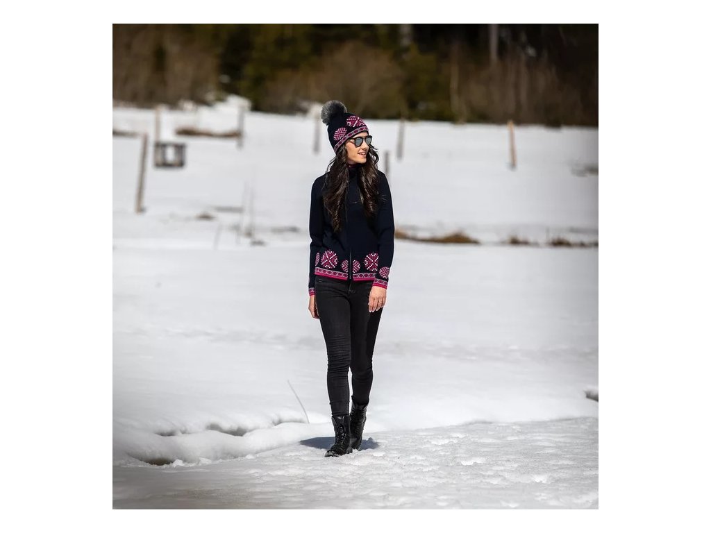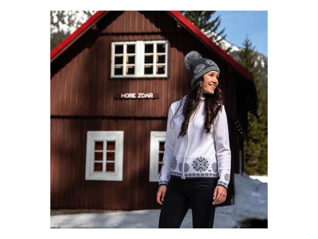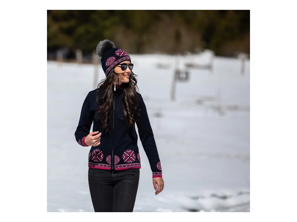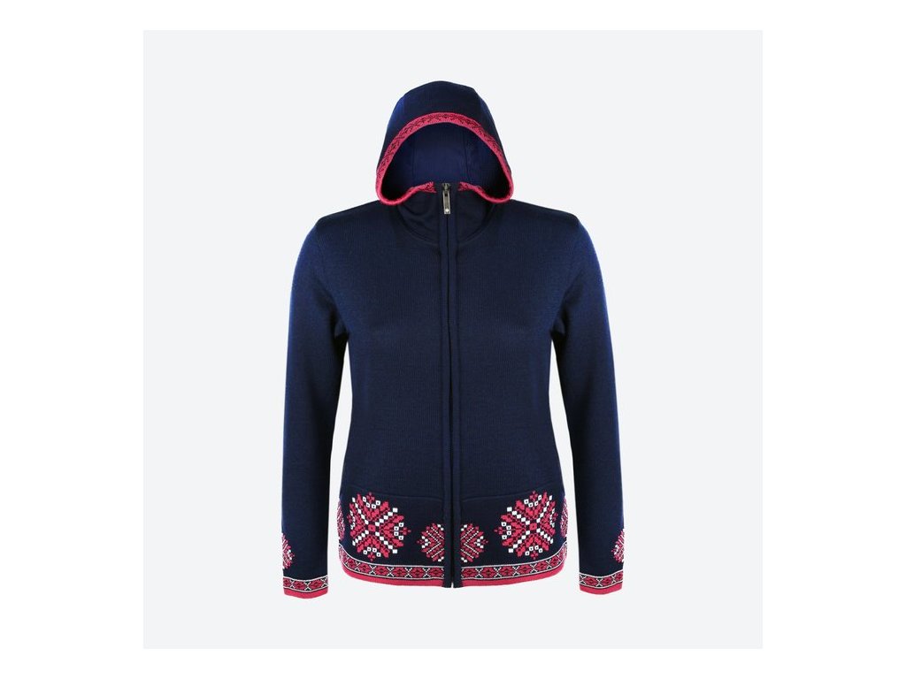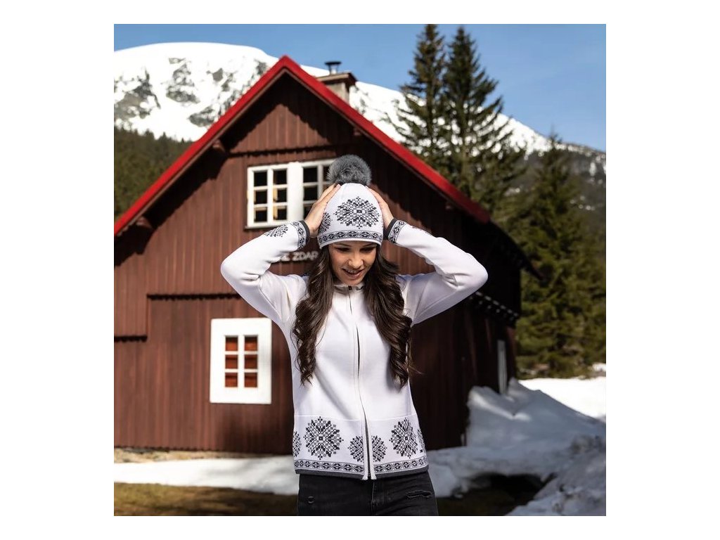 Osobitý dámský svetr s kapucí zdobí originální motiv u spodního okraje těla a rukávů. Svetr je středně teplý a hodí se k běžnému nošení. Kvalitní příze Schoeller se snadno udržuje.